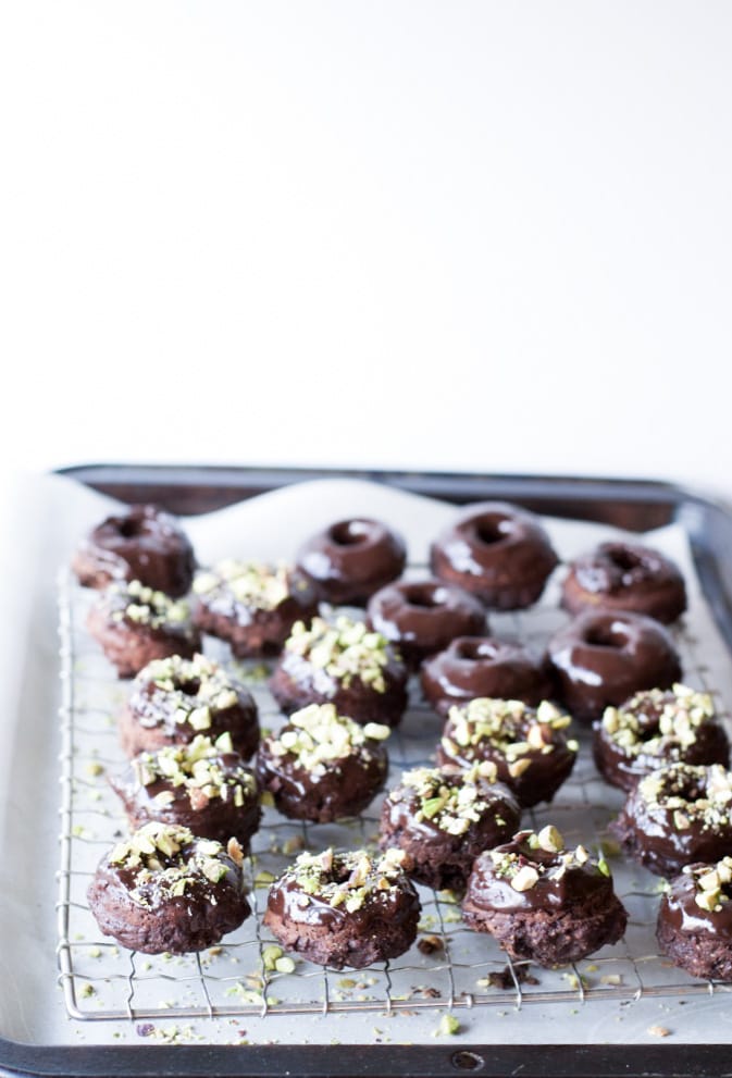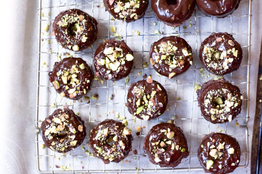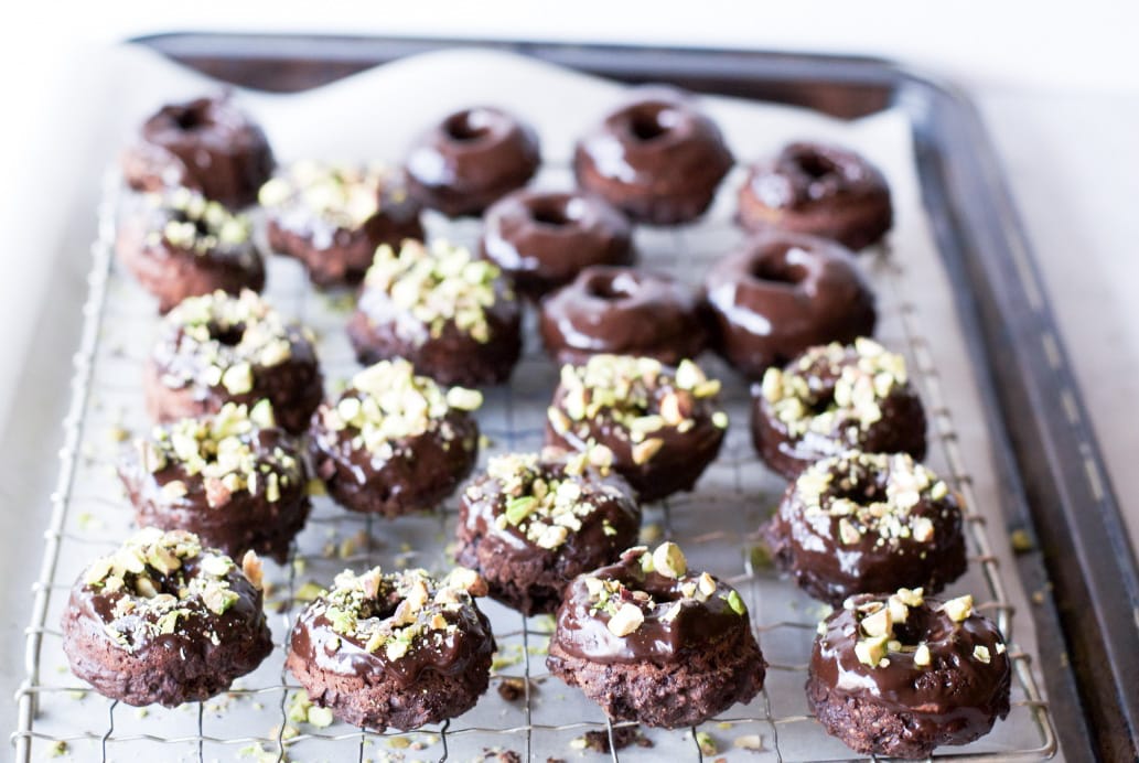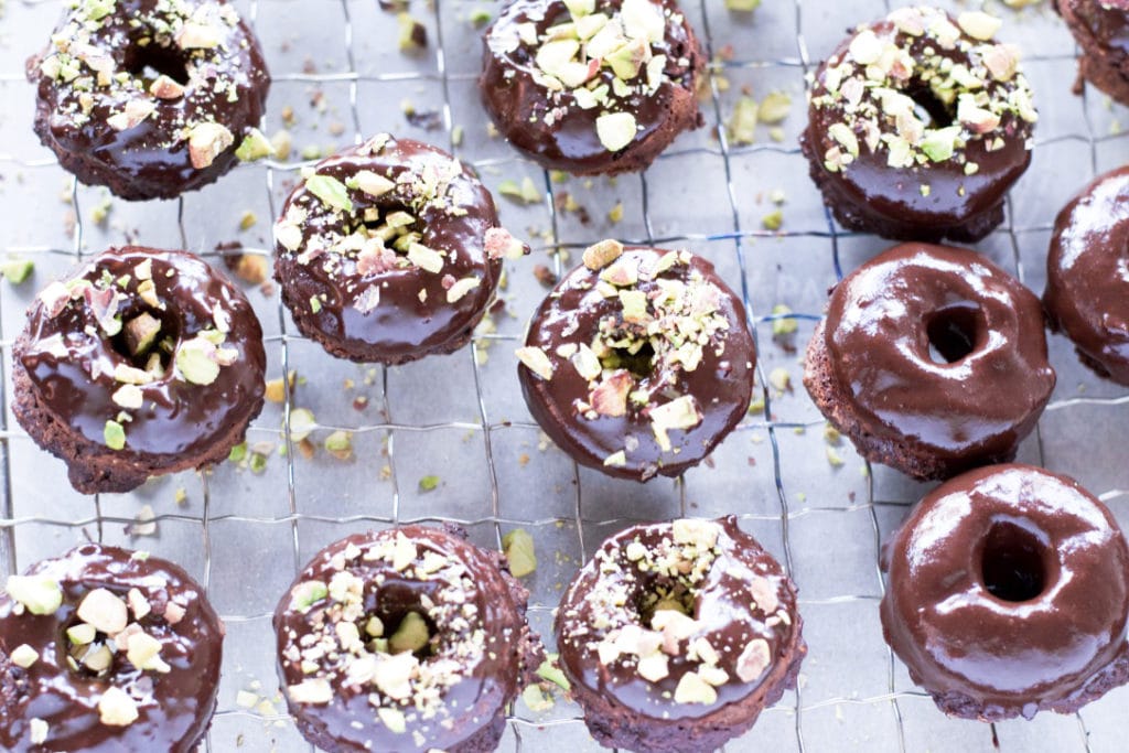 - À la sortie du four, laisser les beignes refroidir sur une grille. Une fois tièdes, tremper le dessus des beignes dans le chocolat fondu (si le chocolat s’étend mal, réchauffer quelques secondes. S’il est trop épais, ajouter un peu de lait).
