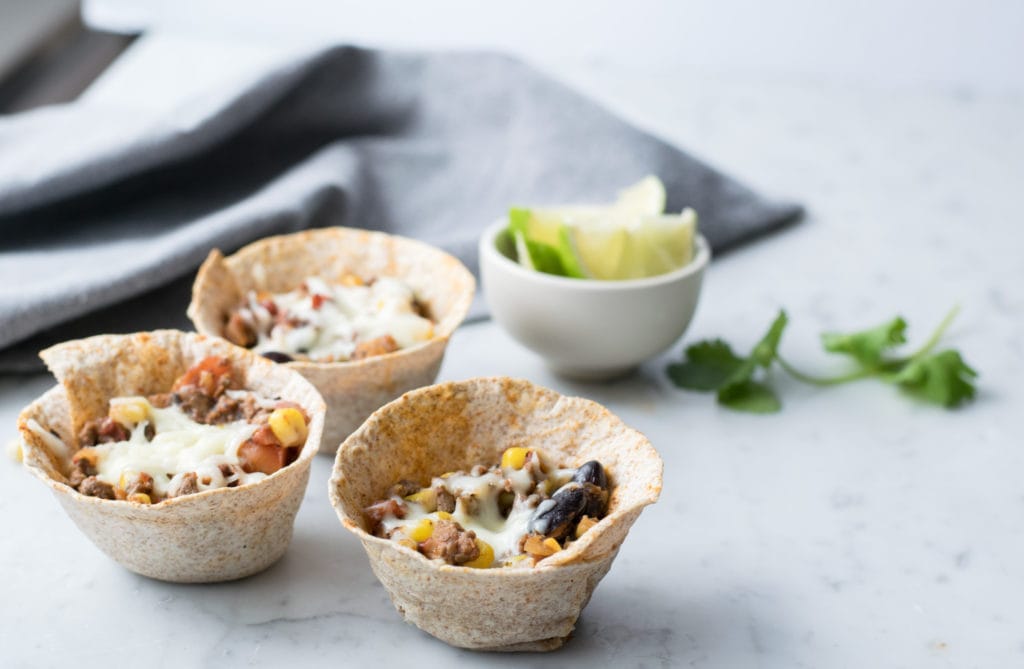 Pour former les bols, j’ai simplement coupé des petits tortillas en 2, les ai badigeonné d’un peu d’huile, puis les ai roulés sur eux-mêmes pour qu’ils aient la forme d’un bol. Je les ai ensuite placés dans un moule à muffins. Mis au four à 350°F environ 10 minutes, ils deviennent croustillants et gardent leur forme de bol !