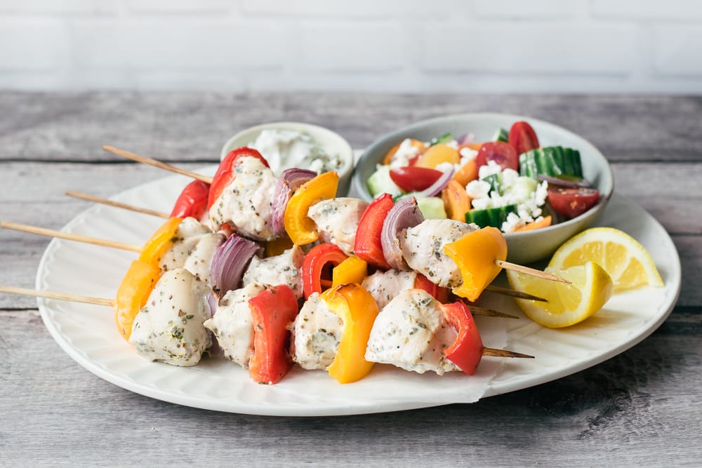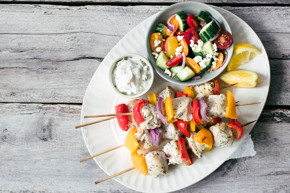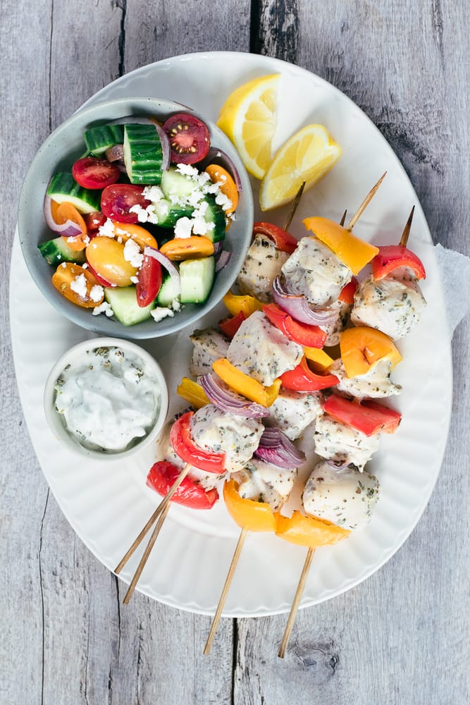 J’ai servi ces brochettes avec de la sauce tzaziki, du riz brun et une salade grecque. Pour une tzaziki maison toute simple, mélanger :