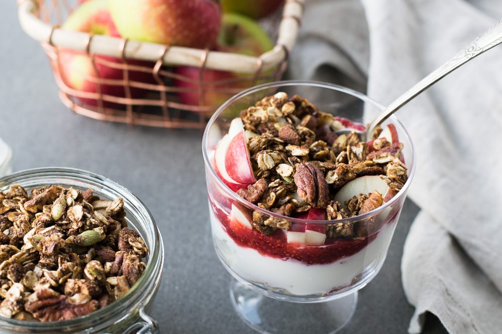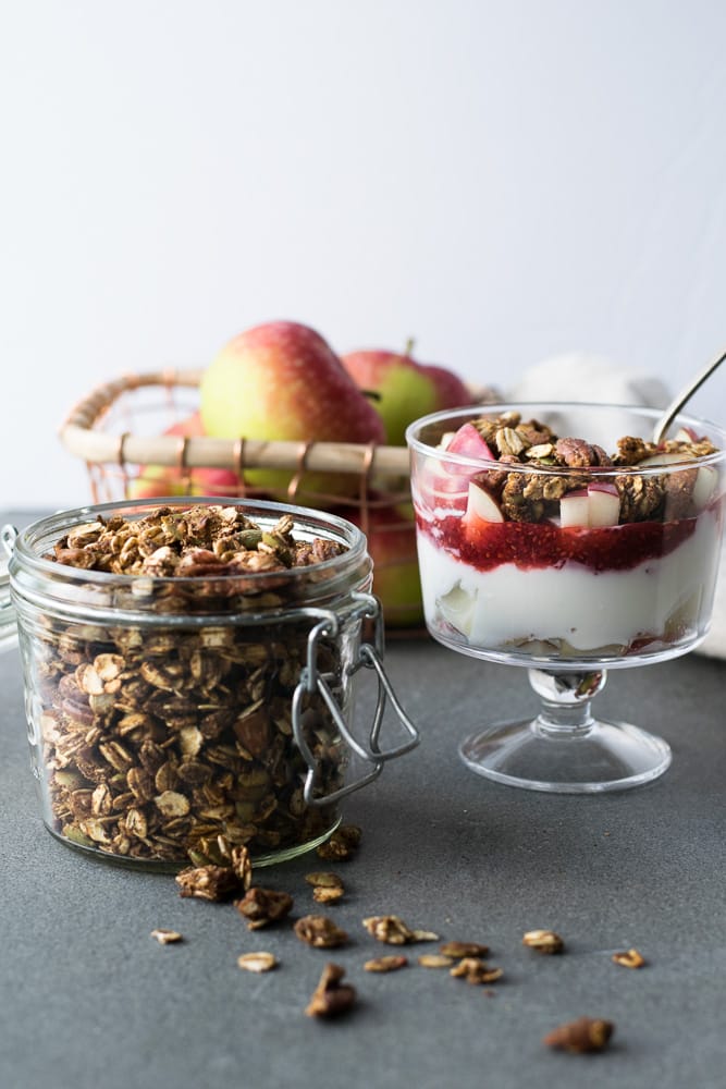 J’adore le granola, et encore plus lorsqu’il est fait maison. J’avais envie de m’inspirer de la température qui descend doucement pour créer un granola aux saveurs d’automne. Rien de mieux pour bien commencer la journée avec un bon café, ou en soirée avec une tisane bien chaude! À saupoudrer partout partout 😉