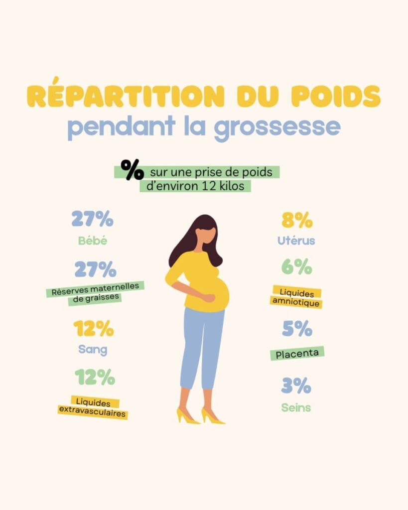 Le gain de poids va bien au-delà d’une simple prise de gras. Le poids gagné comprend à la fois le poids du bébé, le poids du liquide amniotique, le poids du sang supplémentaire dans le corps, et bien d’autres composantes. Rappel amical : Ton corps n’est pas uniquement un chiffre sur la balance, mais plutôt un allié qui te permet de porter un enfant et de bâtir la vie.