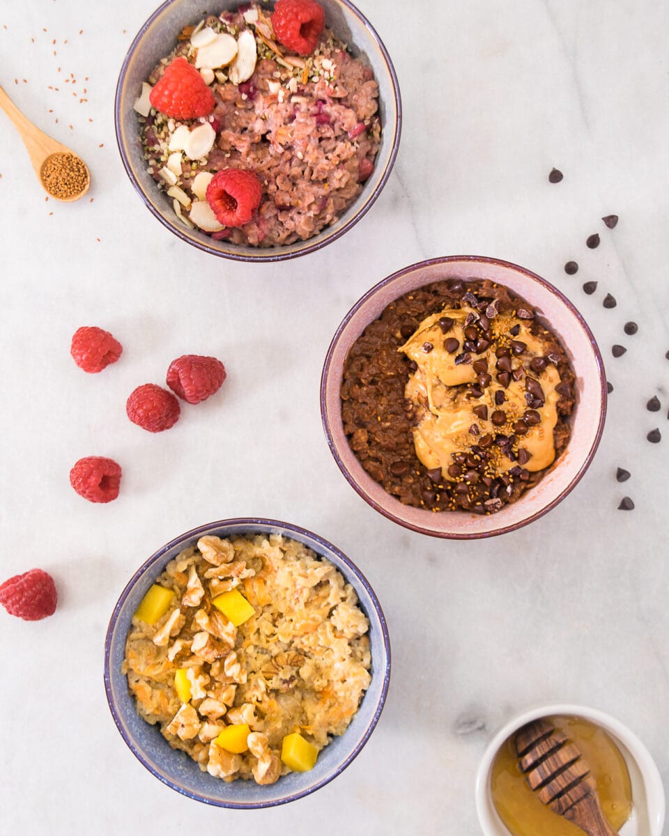 Cette recette toute simple adaptée en 3 versions (petits fruits, chocolat et beurre d’arachide et gâteau aux carottes) est parfaite pour dire bye bye au gruau en sachet! C’est un bon point de départ si tu n’es pas habitué à cuisiner le gruau. Une fois que tu as le tour et que tu sais quelles combinaisons de saveurs tu préfères, il ne reste plus qu’à créer tes propres mélanges.