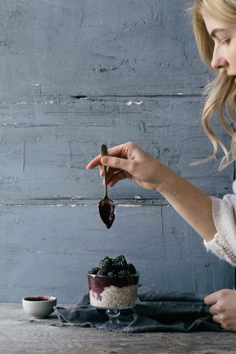 - Pour la purée: Placer les mûres surgelées dans un bol et cuire au four à micro-ondes 25 secondes. À l’aide d’une fourchette, écraser les mûres. Ajouter le sirop d’érable, les graines de chia et le jus de lime et bien mélanger. Réserver.