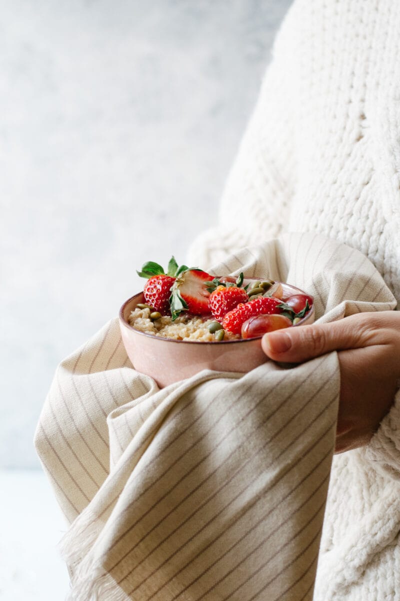 Le gruau aura un goût de noisette et une texture différente des flocons. Point bonus pour ses valeurs nutritives : il contient deux fois plus de fibres solubles et 1,5 fois plus de protéines, ce qui en fera un déjeuner très soutenant. J’ai choisi du gruau à cuisson rapide afin de réduire le temps de cuisson au minimum.