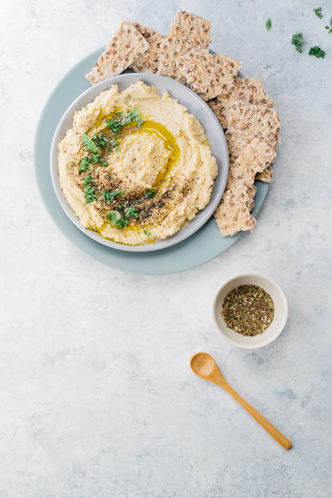 - Goûter et rectifier l’assaisonnement au besoin. Verser l’houmous dans un plat et ajouter le zaatar et l’huile.