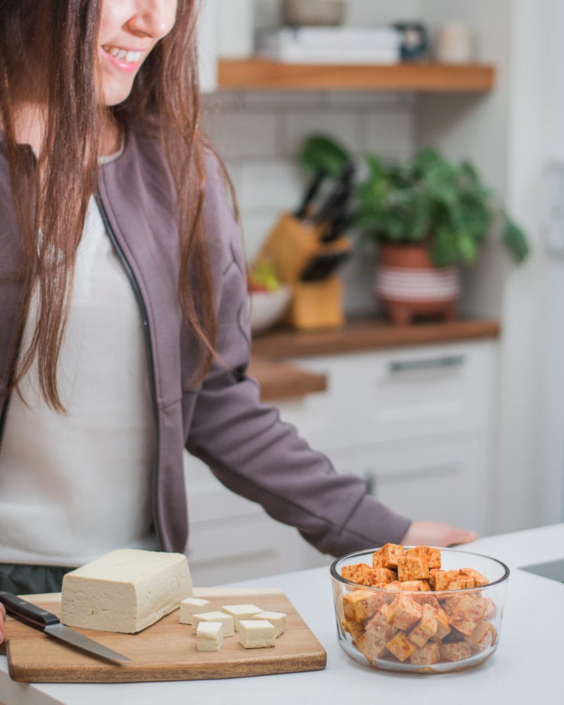 - J’aime bien cuisiner avec le tofu extra-ferme, car celui-ci conserva bien sa forme lorsqu’on le presse et lors de la cuisson.