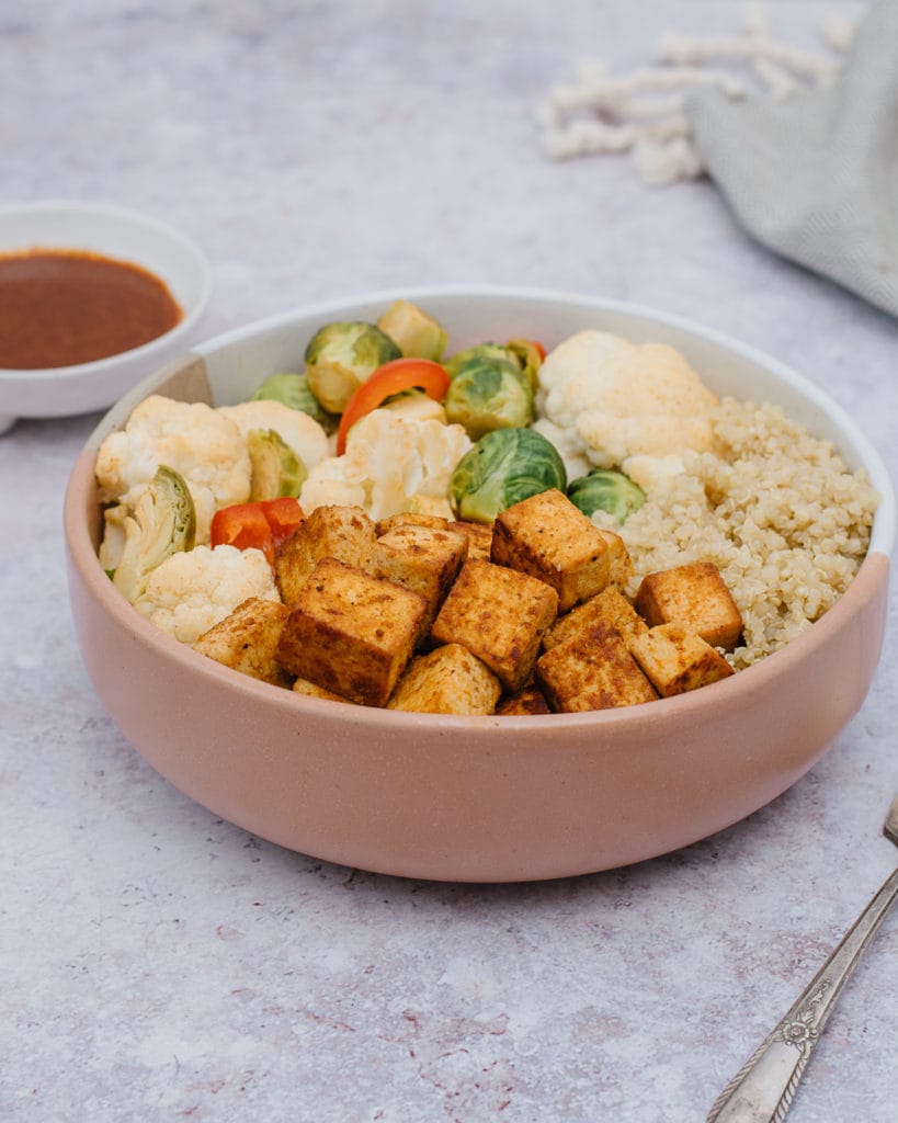 Le tofu aux saveurs de BBQ sera délicieux dans un bol repas. J’ai choisi de doubler la quantité de marinade, afin de l’utiliser pour assaisonner les choux de Bruxelles pendant la cuisson, et j’ai utilisé le reste comme sauce pour mon bol. Un délice!