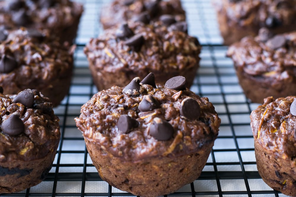Excellents en collation ou au déjeuner, ces muffins double chocolat aux courgettes satisferont ton envie de sucré tout en étant nutritifs. Puisqu’ils ne contiennent ni oeufs ni produits laitiers, ils conviennent aussi aux personnes intolérantes ou allergiques. Les courgettes râpées rendent les muffins moelleux, et tu ne les remarqueras presque pas, promis!