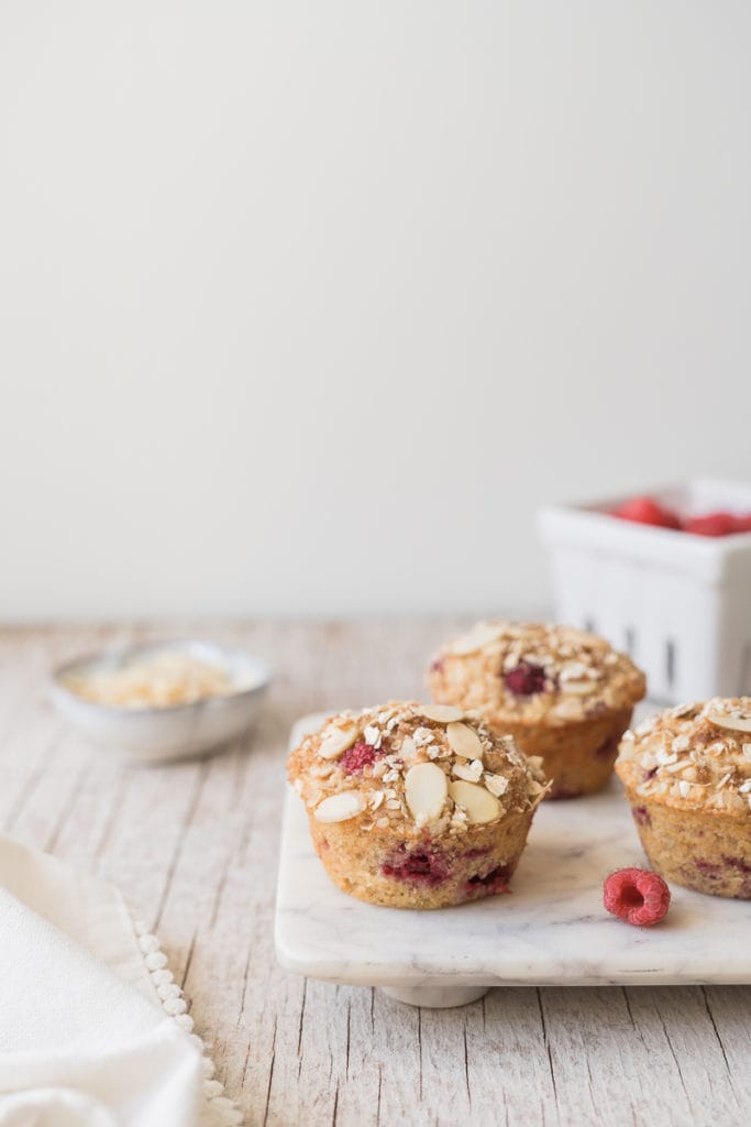 Pour en faire un déjeuner complet, j’aime bien accompagner mes muffins aux framboises d’un yogourt, ou encore le tartiner de beurre d’amande.