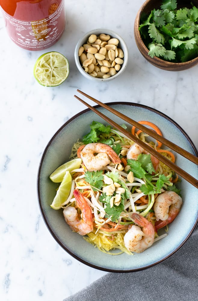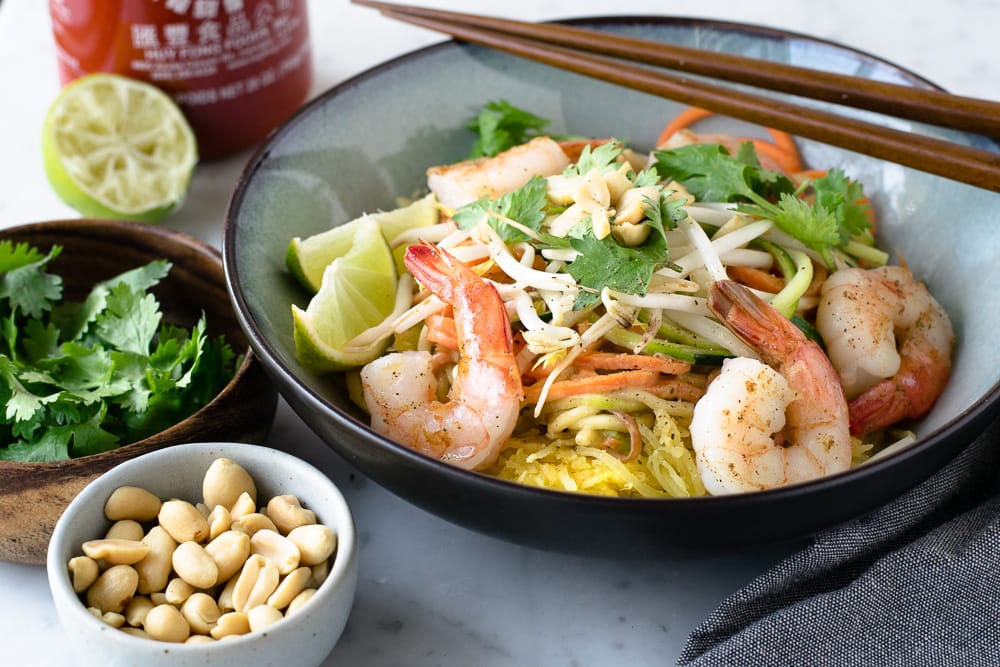 Dans ce pad thaï, la courge spaghetti, la carotte et la courgette spiralisées remplacent les nouilles, ce qui en fait une version riche en fibres et en vitamines, faible en glucides et sans gluten.
