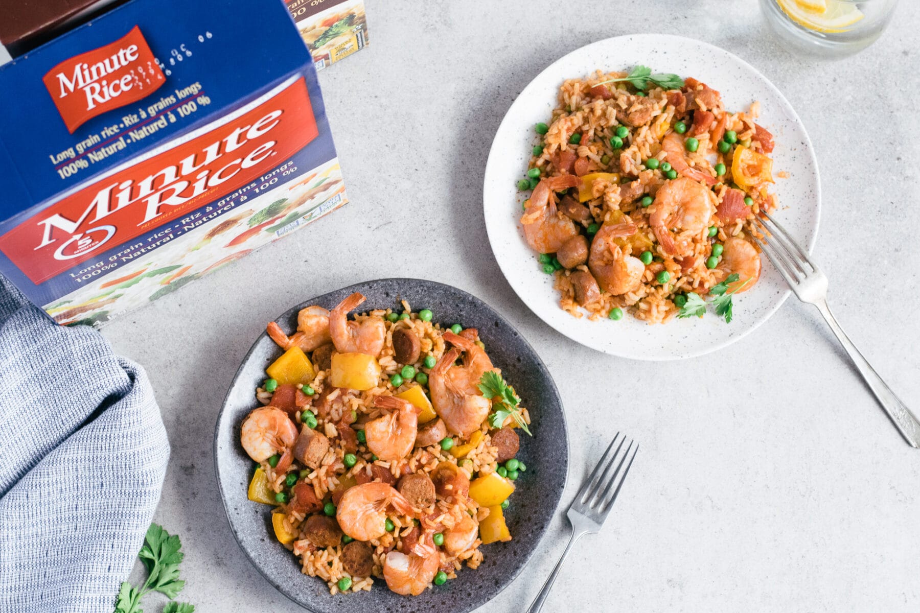 Quand le tourbillon du quotidien me laisse peu de temps pour cuisiner, je suis bien contente de connaître certains raccourcis qui me permettent de préparer un repas complet en quelques minutes. Je te propose cette version ultra-rapide de la classique paella, rendue possible grâce au riz Minute Rice. Cette recette de paella sera prête en moins de temps qu’il n’en faut pour commander de la pizza. Je te conseille de doubler la recette, tu seras content(e) qu’il en reste pour les lunchs!