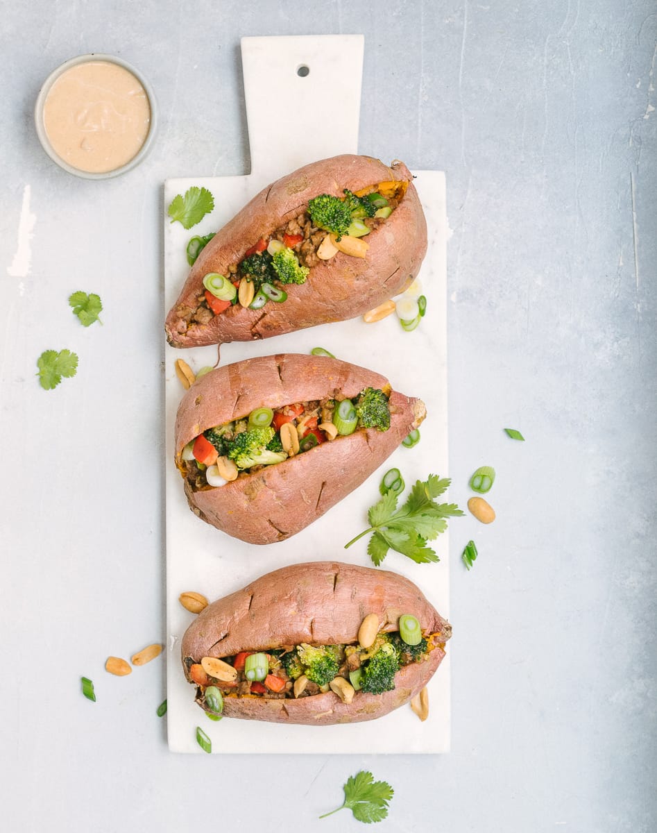 Vous me l’aviez demandée : voici la version végé de ma recette de patates douces farcies au poulet Satay !