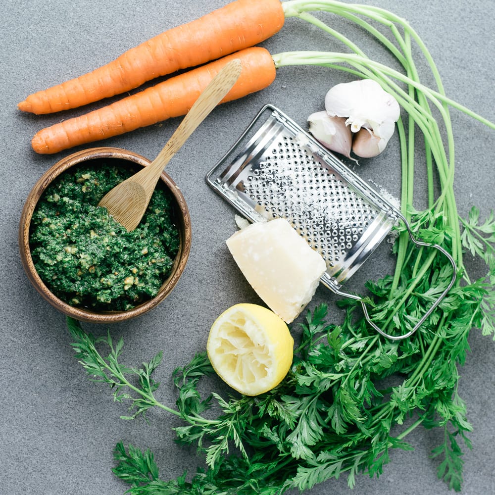 Ma façon préférée d’utiliser les feuilles de légumes est d’en faire du pesto, que j’utilise ensuite pour garnir mes sandwichs, aromatiser mes pâtes et mes salades ou remplacer la sauce tomate sur la pizza. Pour faire du pesto traditionnel, tu peux utiliser cette recette et simplement remplacer les fanes de carottes par du basilic. Personnellement, je préfère utiliser les noix de Grenoble plutôt que les noix de pins, car elles sont beaucoup moins chères et tout aussi délicieuses.