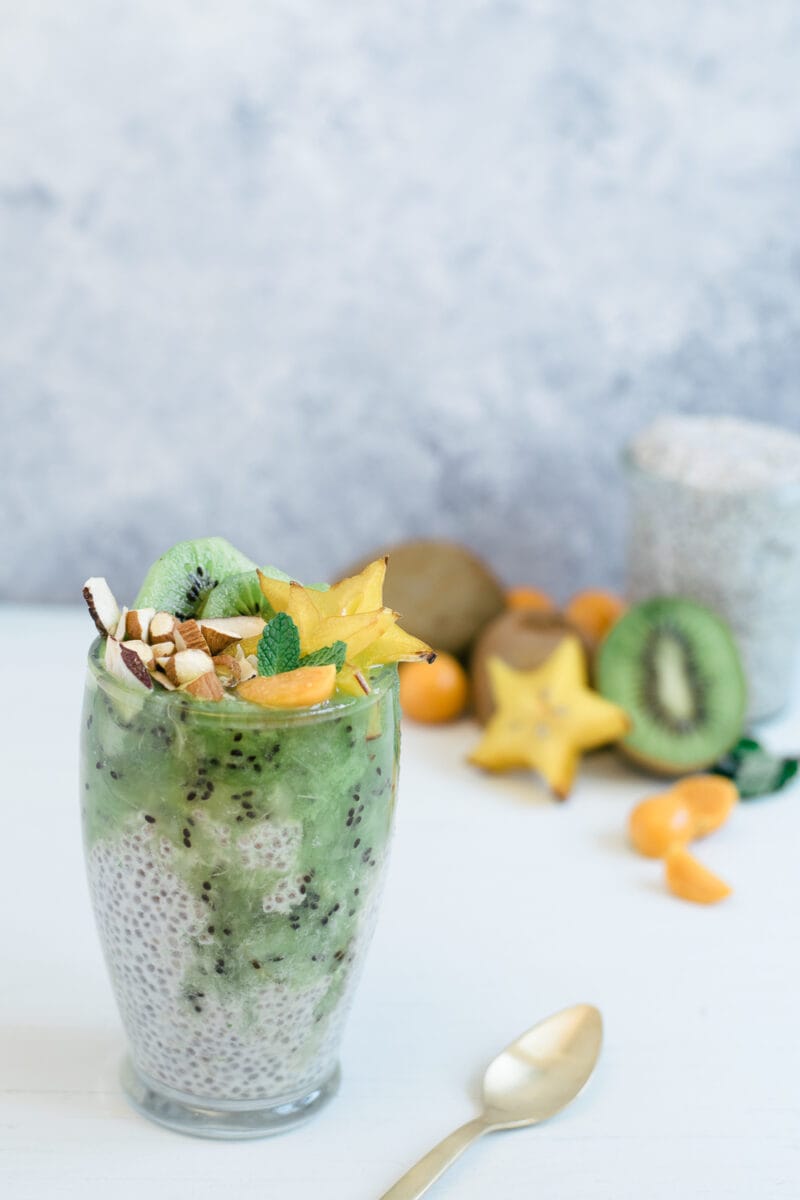 - Verser la purée de kiwis sur les 2 pouding de chia.