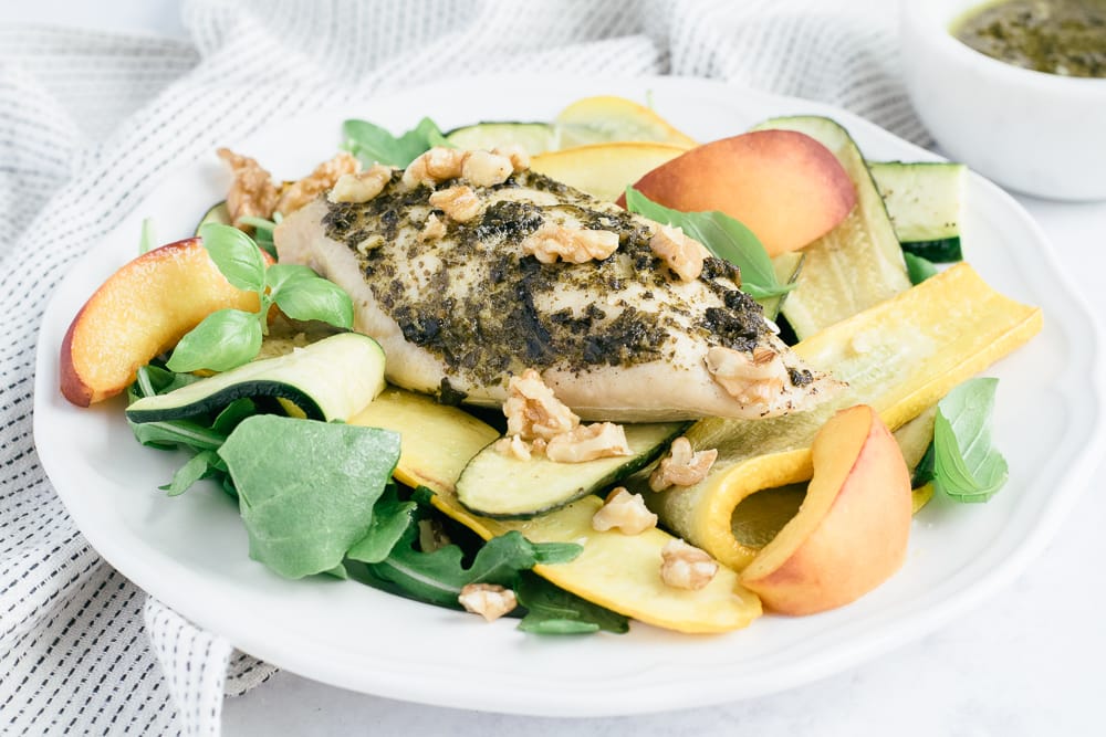 Poitrine de poulet grillée au pesto, courgette et pêches