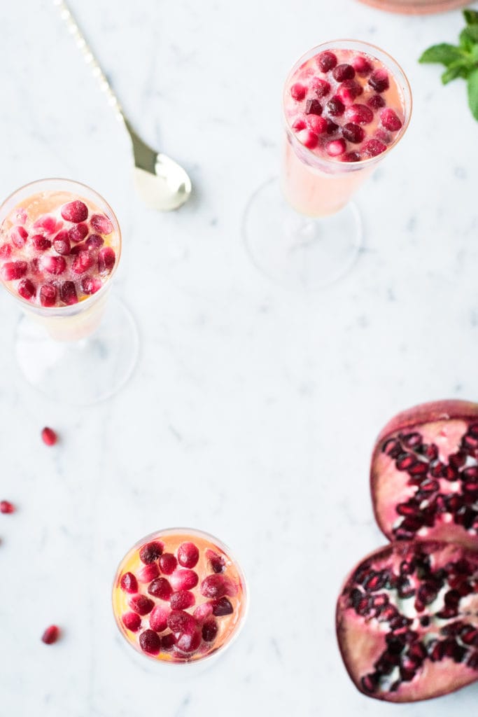 - Au moment de servir, verser le vin mousseux et le kombucha, et mélanger délicatement. Ajouter les arilles de grenade congelées.