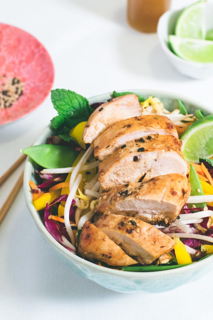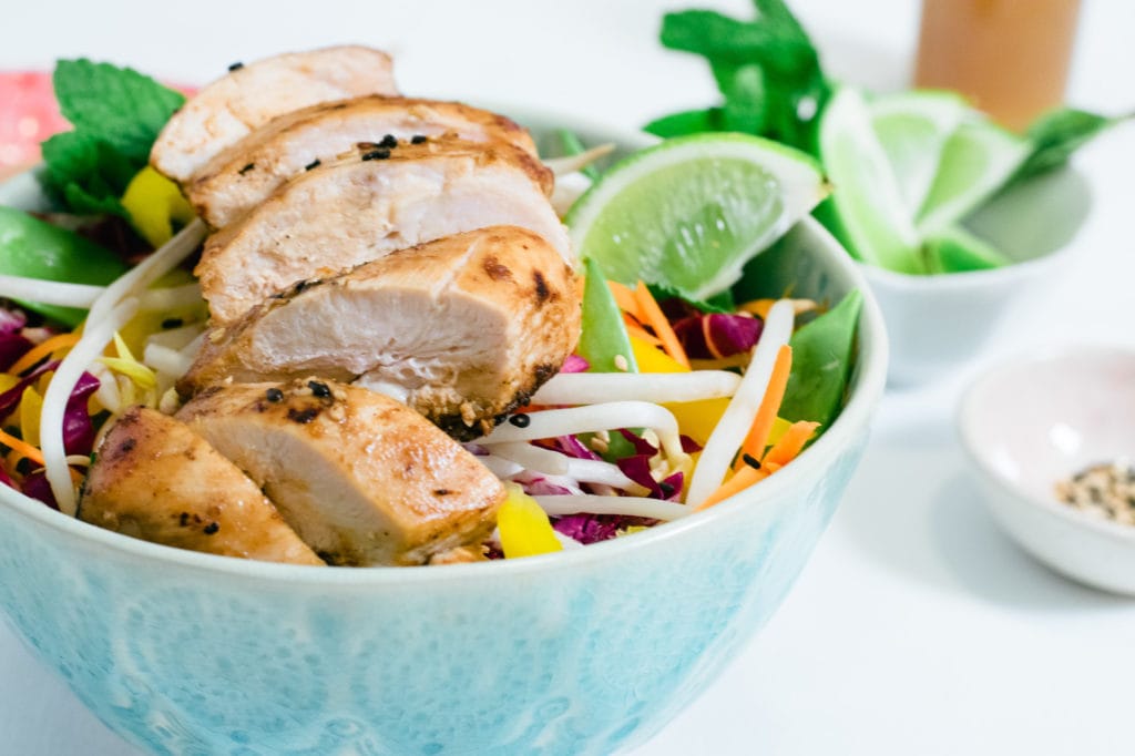 - Servir le poulet sur les légumes et ajouter la vinaigrette réservée à l'étape 1. Si désiré, saupoudrer de graines de sésame et décorer de quartiers de lime.