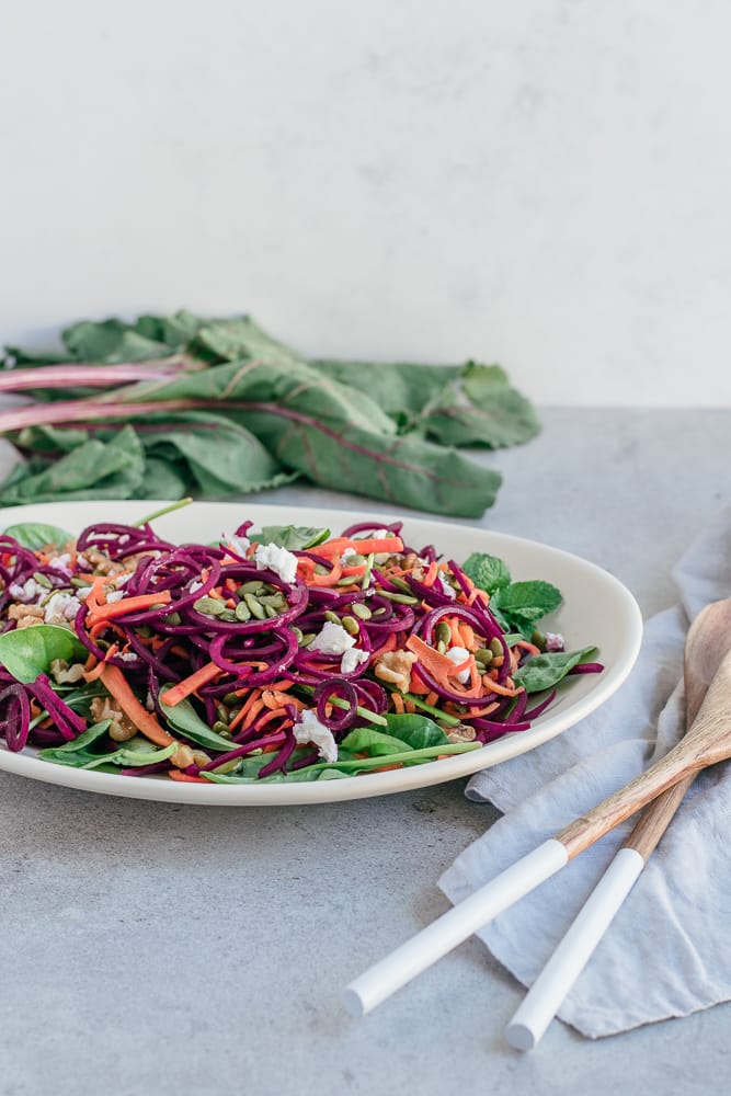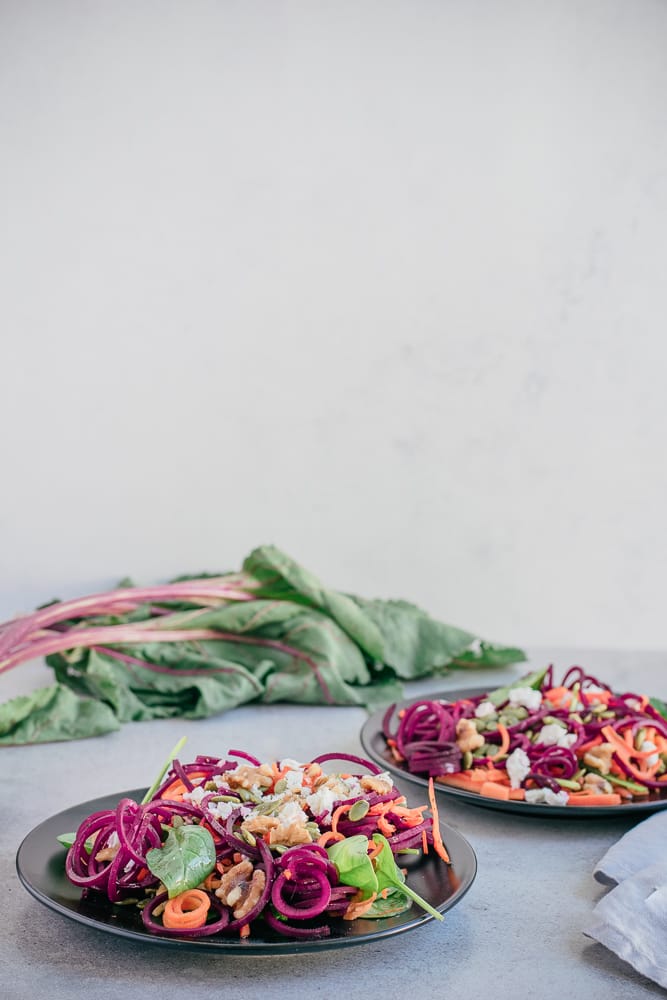 Si tu me suis depuis un certain temps, tu connais mon amour pour les salades repas. Celle-ci est ma favorite du moment : une salade de betterave, carotte et fromage de chèvre. Les couleurs vibrantes et les différentes textures dans cette salade me donnent envie d’en manger encore et encore! Si tu n’as pas de spiraliseur, tu peux râper la betterave crue, ou encore utiliser des betteraves cuites. J’ai choisi les spirales pour une question de look, mais il ne faut pas s’empêcher de faire la recette si tu n’as pas cet outil! Tes collègues seront certainement jaloux de ton lunch 😉