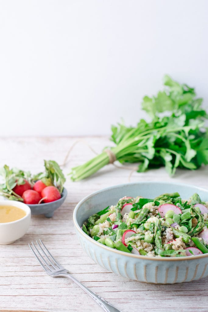 Ma salade printanière préférée: une salade repas toute fraîche composée de quinoa, d’asperges et de radis. Parfaite pour mettre en valeur les légumes d’ici!