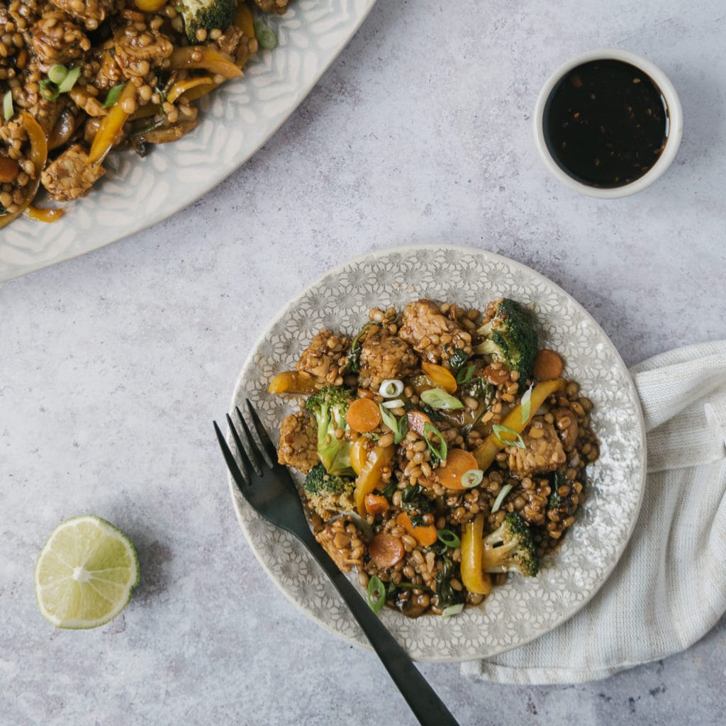 Le tempeh teriyaki accompagné d’orge et de légumes est à mon avis une recette parfaite pour apprendre à aimer le tempeh! La marinade, qui devient par la suite une sauce, ajoute énormément de saveur. J’aime bien accompagner ce plat d’orge, car sa forme ronde rappelle les grains de soya dans le tempeh.