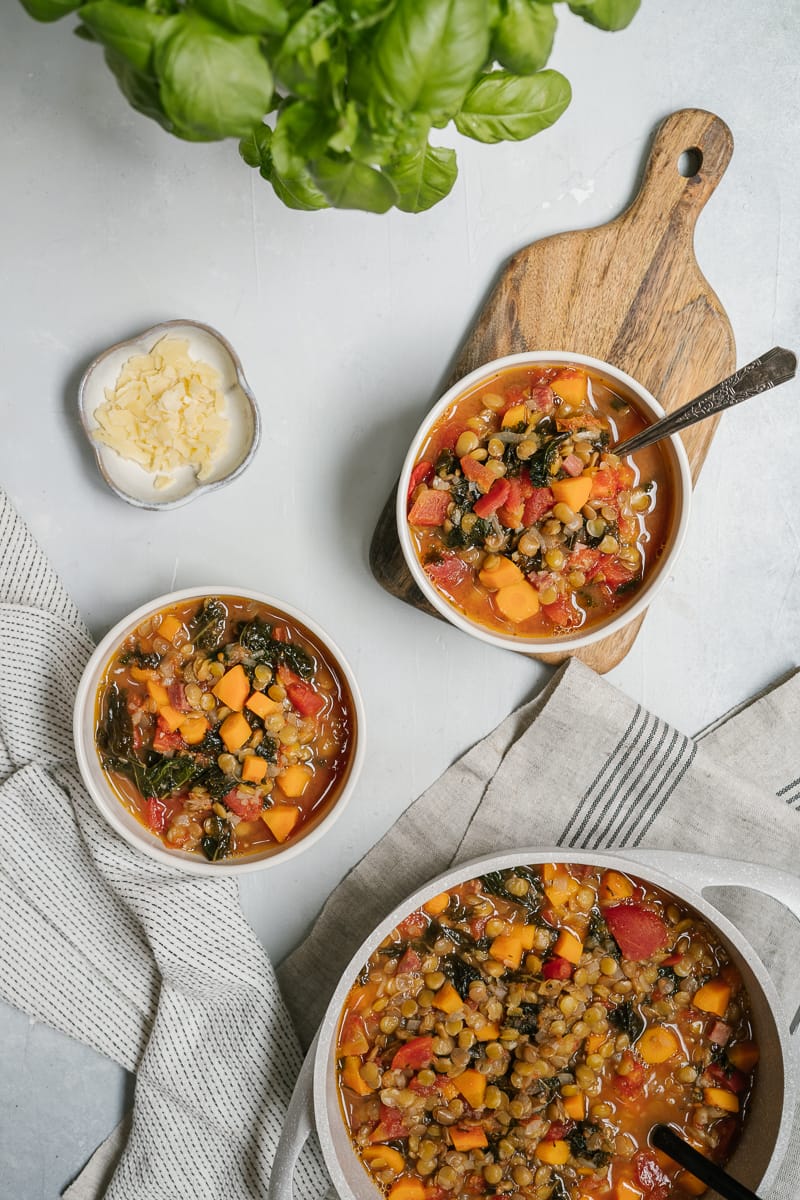 On pourrait replacer les lentilles par des haricots blancs ou noirs. Toutefois, puisque ces derniers nécessitent un temps de trempage avant la cuisson, je vous conseillerais de sauver du temps et d’opter pour des haricots en conserve. Il faudra alors les ajouter à la toute fin, en même temps que le kale, puisque les légumineuses en conserve sont déjà cuites. Si vous préférez acheter des haricots secs, il faudra les faire tremper la veille avant de les ajouter à la soupe. Le temps de cuisson variera selon la légumineuse utilisée.