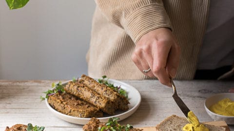 Transférer dans le moule. Cuire 60 minutes ou jusqu’à ce que le végépâté soit bien doré. Laisser tiédir au moins 15 minutes, couper en 6-8 portions et démouler.