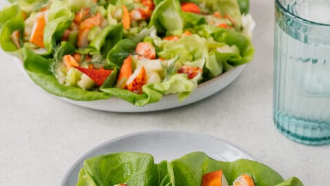 Détacher les feuilles de la laitue Boston et les déposer sur un plateau de service. Garnir les feuilles du mélange de homard. Servir immédiatement.