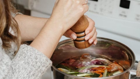 Filtrer le bouillon pour retirer les épluchures. Goûter et rectifier l’assaisonnement au besoin.