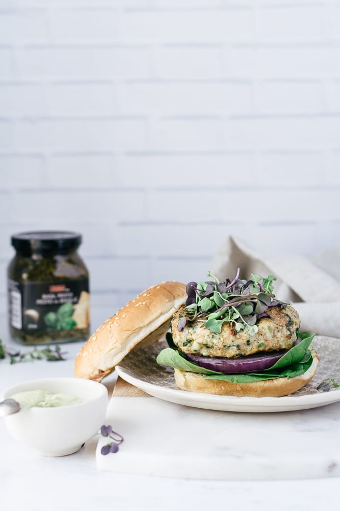 Pour servir, étendre la mayonnaise au pesto sur les pains, placer une galette de dinde et ajouter tes garnitures préférées (tomate, oignon, laitue…)