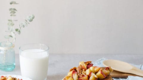 Au moment de servir, ajouter les pommes caramélisées préparées à l’étape 1 sur le dessus des crêpes.