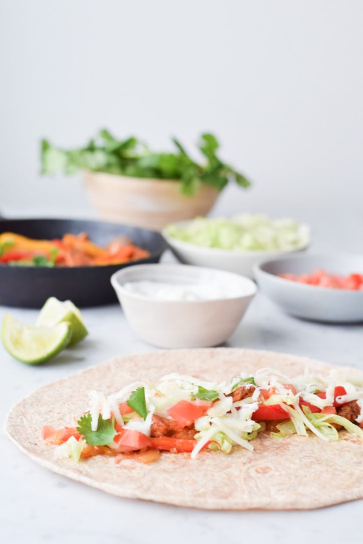 Si désiré, faire chauffer les tortillas quelques secondes au micro-ondes ou dans une poele. Placer le poulet, les tortillas et les accompagnements sur la table et laisser chaque personne garnir son tortilla à son goût. Pour former le fajitas, placer les garnitures désirées au centre du tortilla en formant une ligne verticale, plier le bas du tortilla par dessus la garniture, recouvrir la garniture avec un côté puis rouler afin d’emprisonner la garniture dans le tortilla.