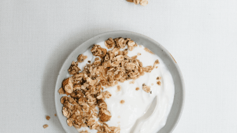 Étendre le granola sur une plaque à cuisson recouverte de papier parchemin et placer au four pour environ 20 minutes ou jusqu’à ce que l’avoine soit légèrement doré.
