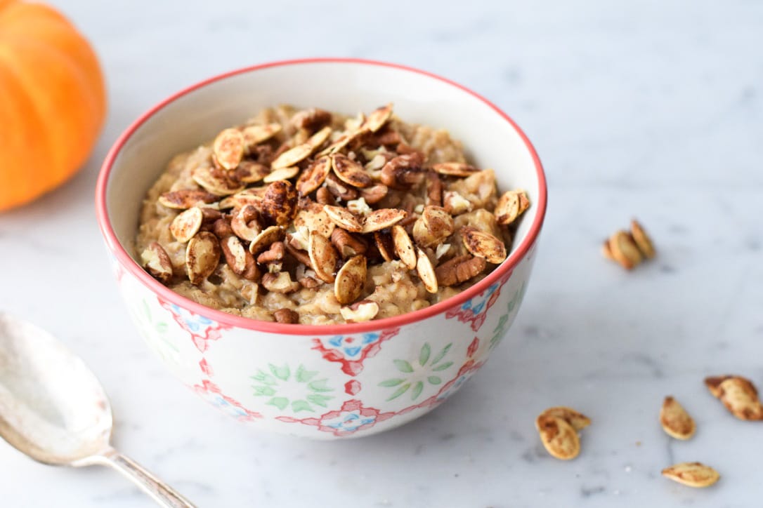 Ajouter le gruau, la purée de citrouille et les cubes de pomme, et laisser mijoter jusqu’à ce que la majorité du liquide soit absorbé (environ 3 minutes), en brassant.