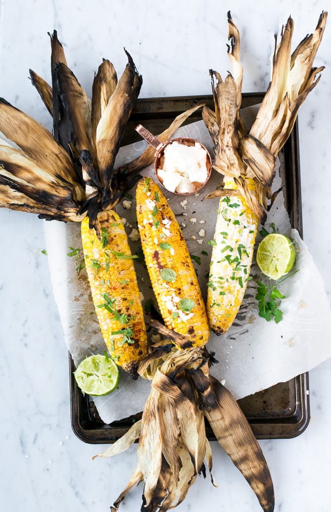 Cuire 8 minutes sur la grille du BBQ à température moyenne-élevée, couvercle fermé, en tournant chaque 2 minutes à l’aide de pinces. Après 8 minutes, éplucher le maïs pour le placer directement sur la grille. Tourner les maïs et retirer lorsque les grains sont légèrement grillés.