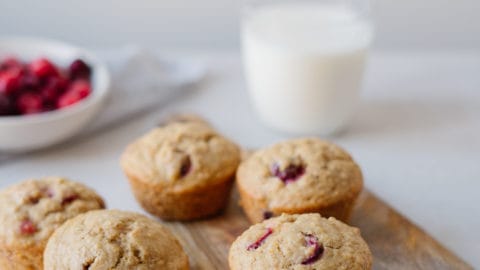 Dans un grand bol, mélanger la farine de blé entier, la farine tout usage, les flocons d’avoine, la poudre à pâte, le bicarbonate de soude et le sel. Ajouter les canneberges coupées.