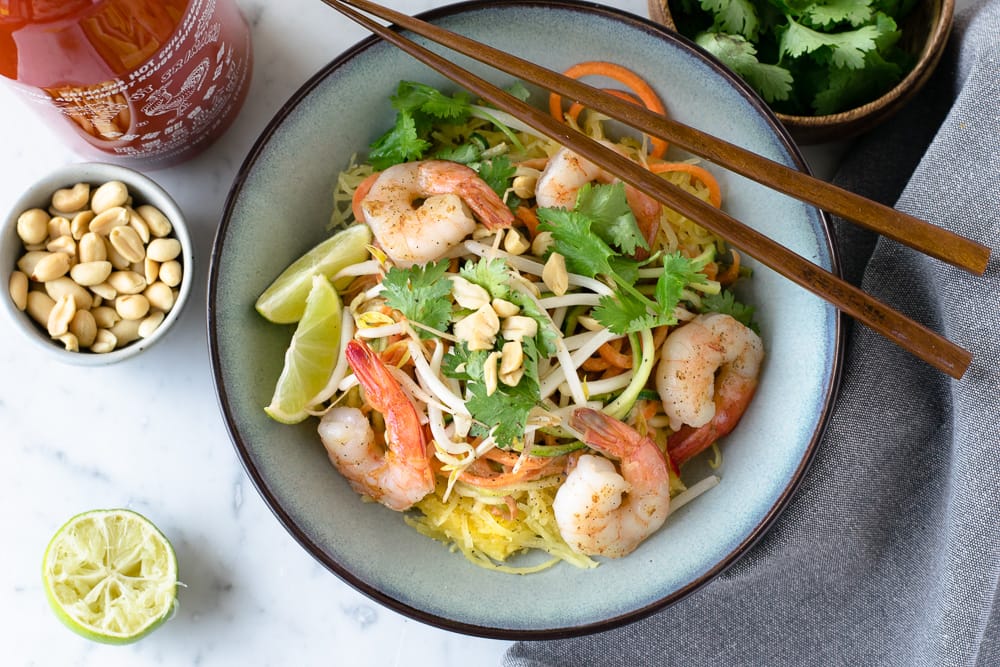 Ajouter la courge spaghetti et bien mélanger. Ajouter les crevettes et réchauffer quelques minutes.