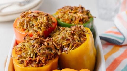 Préchauffer le four à 375 °F. Couper la tête des poivrons, retirer les pépins. Placer les poivrons dans un plat allant au four et réserver.