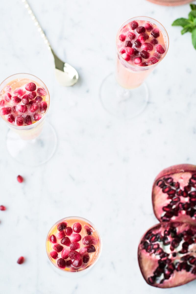 Au moment de servir, verser le vin mousseux et le kombucha, et mélanger délicatement. Ajouter les arilles de grenade congelées.