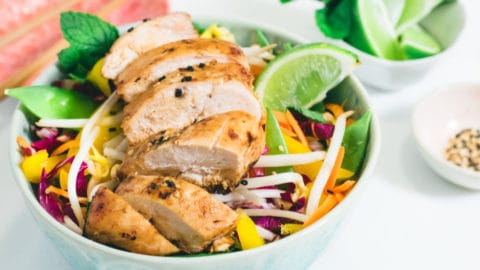 Servir le poulet sur les légumes et ajouter la vinaigrette réservée à l'étape 1. Si désiré, saupoudrer de graines de sésame et décorer de quartiers de lime.