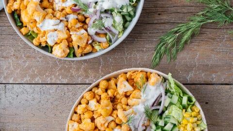 Répartir les ingrédients de la salade et le mélange de pois chiches et de choux-fleurs grillés dans deux bols.