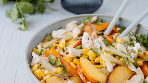 Dans un grand bol, mélanger le fenouil, les pêches,le poivron, l’oignon, le maïs, le jalapeno, la coriandre et le feta.