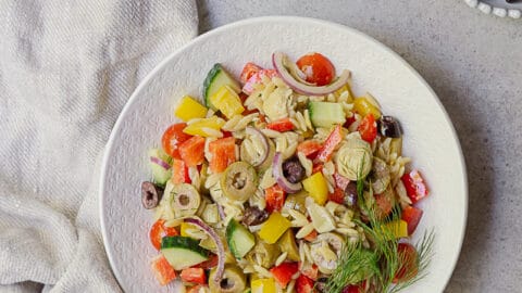 Dans un grand bol, combiner l'orzo cuit, les poivrons, les olives, les artichauts, les oignons rouges, les tomates cerises et le concombre. Mélanger