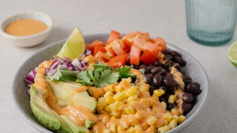 Dans un bol, placer le quinoa, les haricots noirs, l’avocat, le maïs, les tomates et oignons rouges.