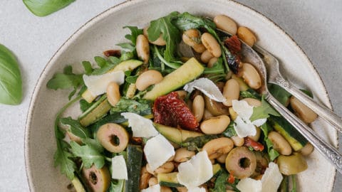 Salade tiède de roquette aux haricots blancs, courgettes et tomates séchées.