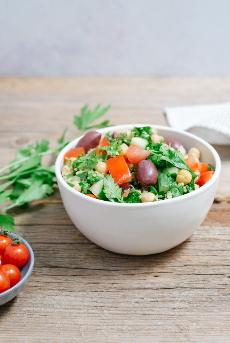 Ajouter le quinoa et les pois chiches aux légumes coupés. Ajouter les olives, l’huile d’olive et le jus de citron. Assaisonner au goût.