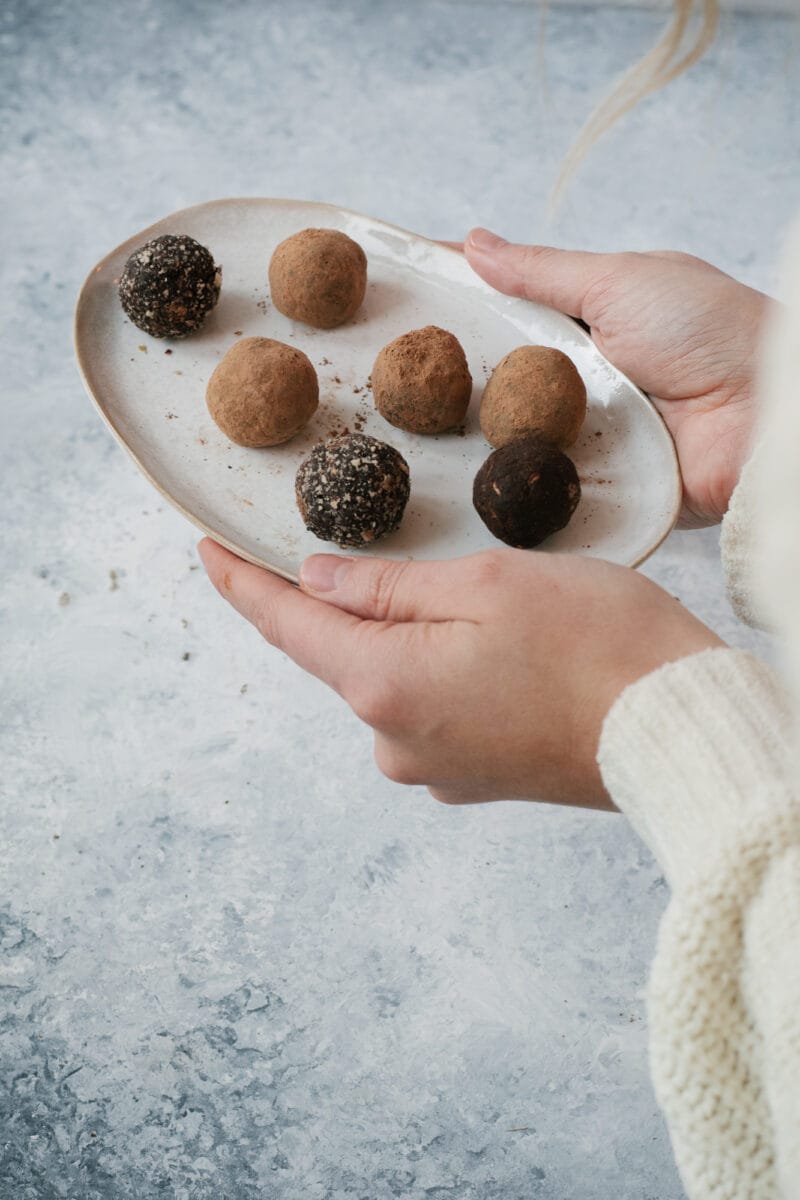 Dans un robot culinaire, réduire tous les ingrédients afin de former une pâte collante. À l’aide des mains, former environ 8 truffes.