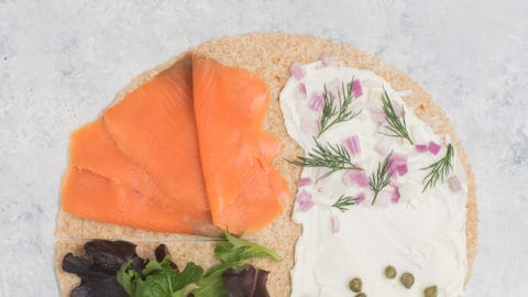 Replier la partie du côté gauche de l’incision (avec le saumon fumé) sur le quart précédent (avec le fromage à la crème et les oignons rouges).