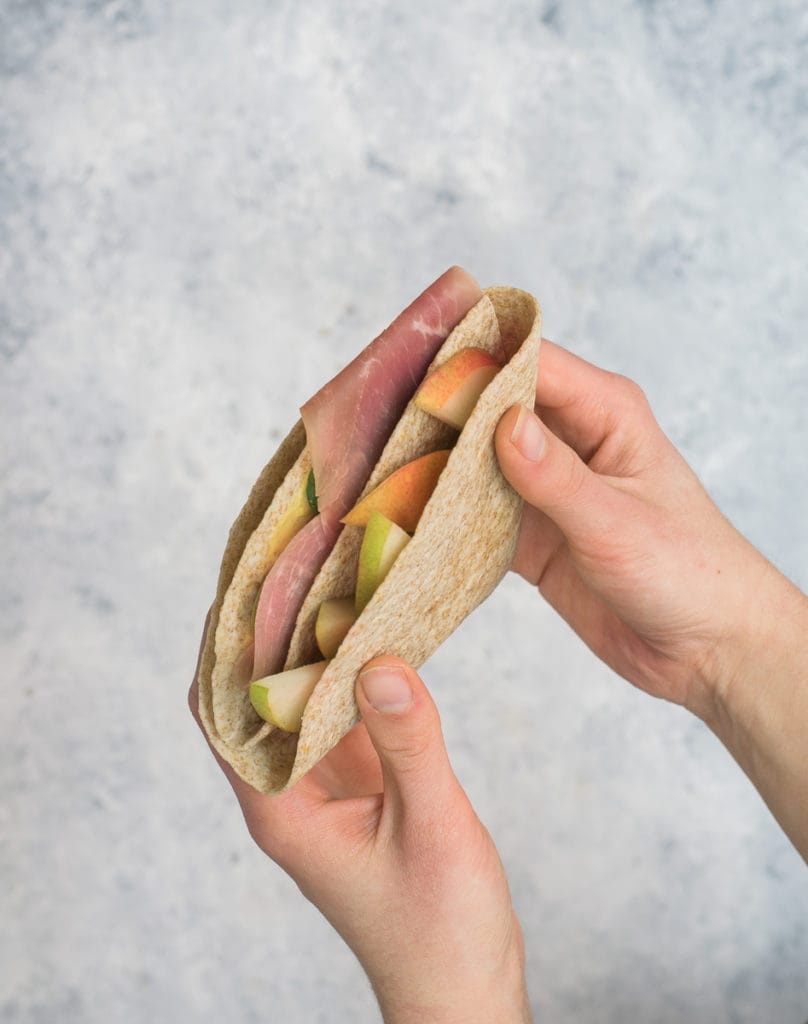 - Ajouter les garnitures: Garnir le premier quart (à gauche de l’incision) de la tortilla du prosciutto. Garnir le 2ième quart de la moutarde de Dijon et des épinards. Garnir le 3ième quart du miel et des tranches de pommes. Garnir le dernier quart du fromage brie. Ajouter du sel et du poivre, au goût.