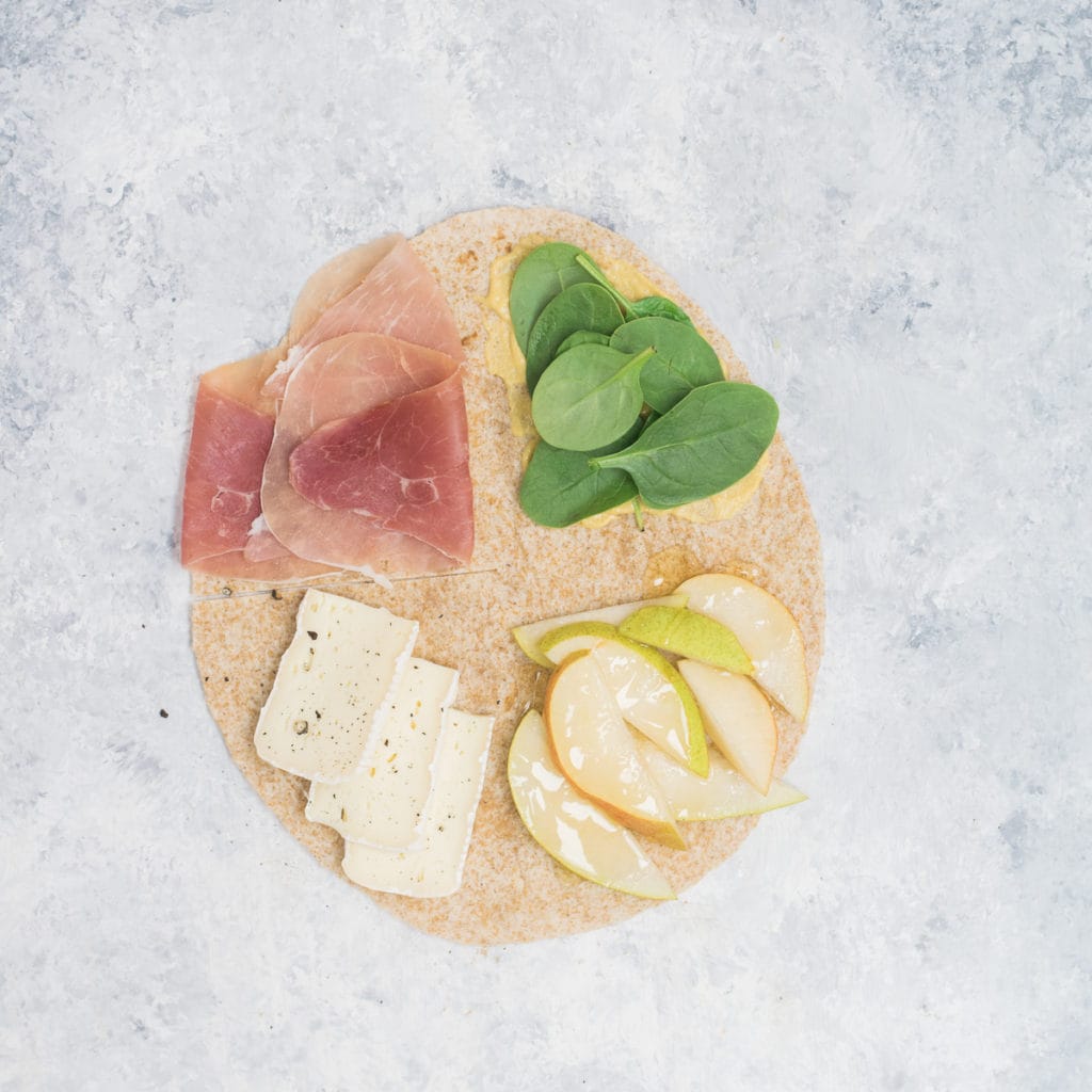 - Plier le wrap : Replier la partie du côté gauche de l’incision (avec le prosciutto) sur le quart précédent (moutarde de Dijon et épinards). Répétez ensuite l’action sur le 3ième quart (miel et poire). Replier la tortilla une dernière fois sur le fromage brie, afin d’obtenir un wrap complètement plié.