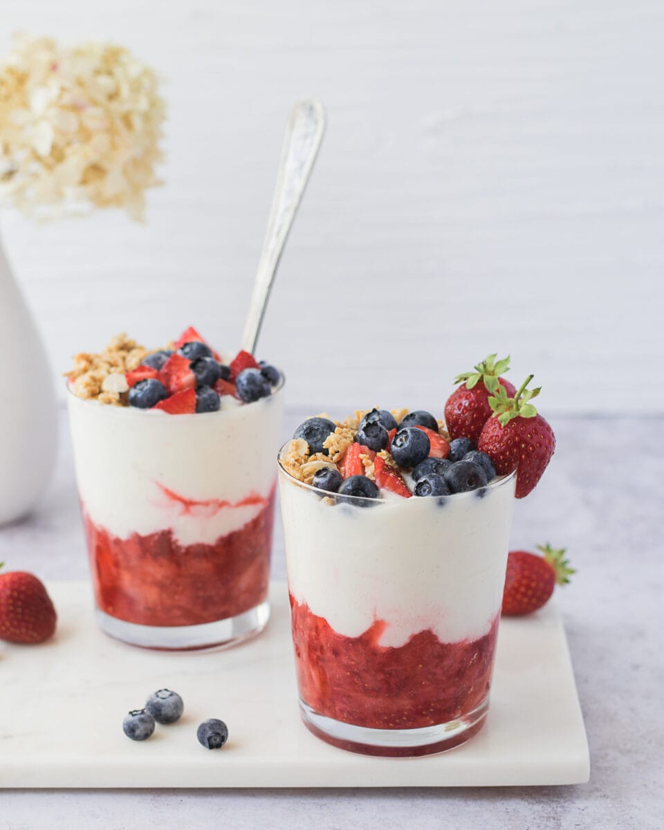 - Napper de yogourt. Garnir des fraises réservées, de bleuets et de granola.